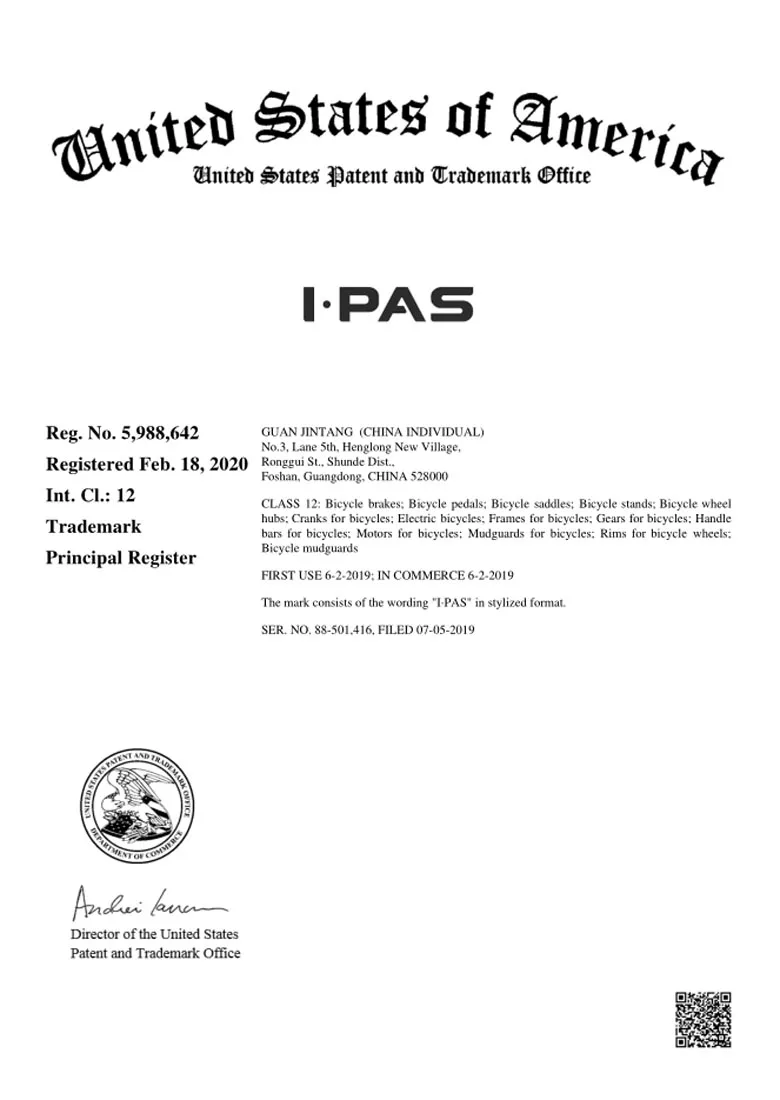 We have developed a patented technology, Intelligent Power Assist System (I-PAS) which makes our bikes more effcient than others.Adhering to the principle that conquer customers' heart with top quality, we set strict standards on our bikes. We have passed ISO900, EEC, EN15194, CE, TUV and other related standards and certifications.