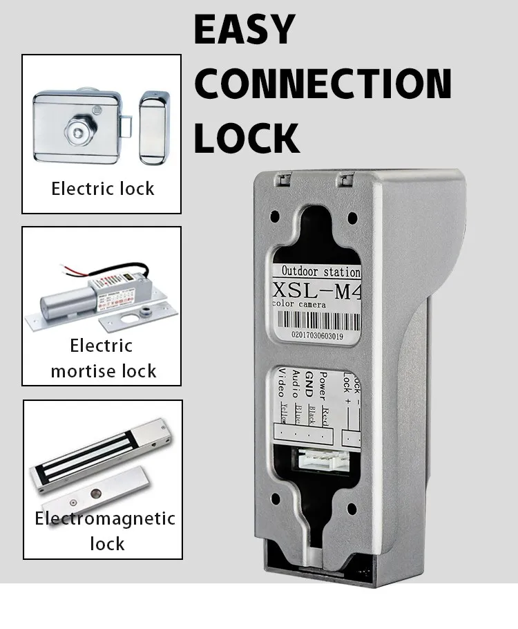 Outdoor camera Performance * CMOS Camera with 700TVL Resolution * 4 LED Infrared Night Lights for night vision * Electric locks(not included) compatible for convenient Access control * IP54 and rainproof cover * Power from indoor monitor * 4-Wire Connection