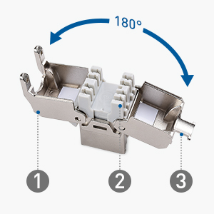 180 DEGREE EASY TERMINATION JACK supports tool free or crimp tool termination; A 180 degree wide-angle, hinged design provides easy access and termination; Tool free cap has universal T568-A or T568-B labels; IDC modules accept a 110 impact tool for wire insertion; Compatible with the Cat6A Crimp Tool Model 180087