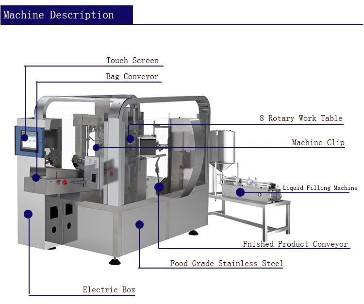 Station 1 Bag Feeding Station 2 Date Printing (option)and Open zipper bag Station 3 Open bag Station 4 Filling Materials Station 5,6,7 :Vibration,Air Removal,Nitrogen Filling,Close Zipper,Hole Punching,Heat Sealing Remark:No.5.6.7.Stations are based on customer requirements for adjusting. Station 8 Heat Sealing and Product Output | ||