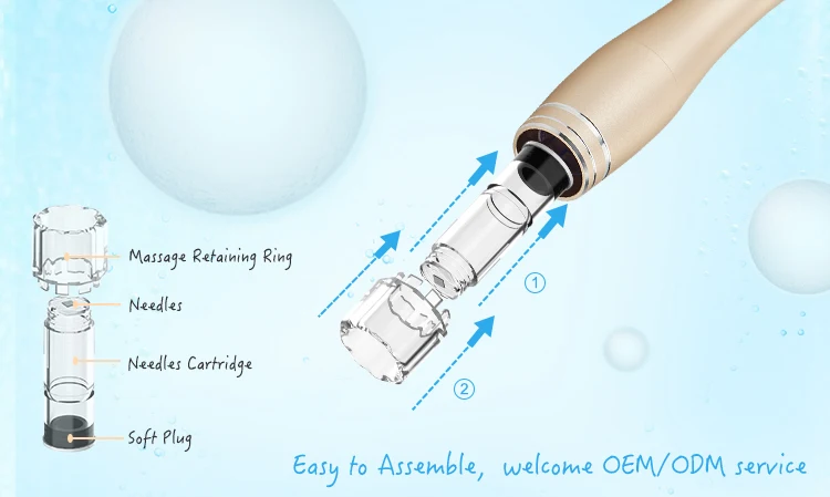1 x Hydra microneedle pen M1 with protection bag; 1 x Round Nano cartridges; 1 x Detailed User Manual ; 1 x US adapter (default) ; 1 x Magnetic suction charging port; 1 x Massage Retaining Ring; 1 x Multifunctional beauty inner box;