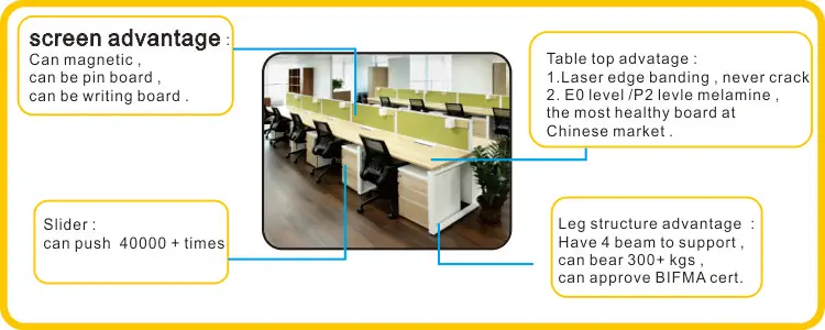 Description | Advantages: 1. FSC/OHSAS18001/ISO9001/ISO14001 product 2. Structure: easy to assemble and choose the color freel 3. Raise up the leg height freel 4. Easy to install and maintain 5. Wire management is flexible |
