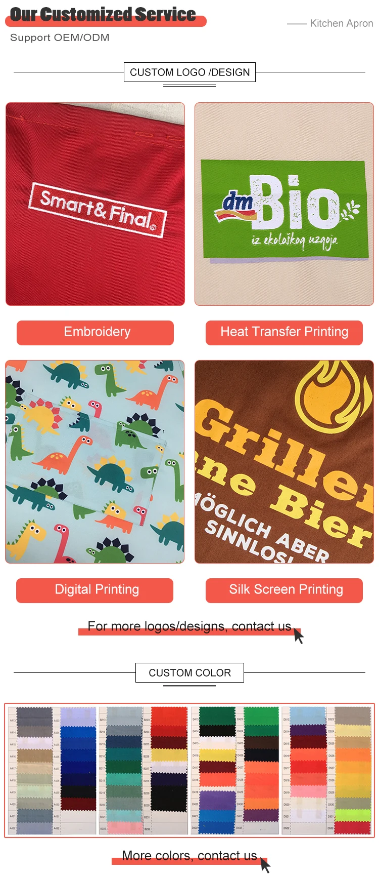 Material | 1) 100% Cotton twill, different weight 2) TC Fabric 65% Polyester 35% Cotton, 80% Polyester 20% Cotton 3) Non-woven fabric ,PVC , TPU, Waterproof Polyester 4) PMS Color Fabric Available |