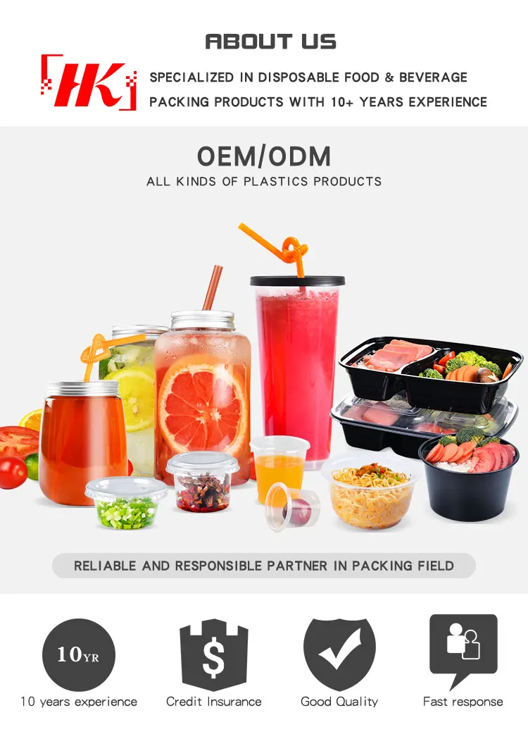 Guangzhou Hongkai Plastic Products Co.,Ltd. is a specialized manufacturer for food & beverage packing products, such as disposable plastic cups, PET bottles, kraft paper cups & bowls, paper bags, fast food container box, Plastic soup bowl, disposable gloves, disposable straws, sealing film, plastic knife and fork & spoon and so on. With experience in this line for more than 10 years, we are able to provide one-stop packing solution as you require. Also we offer OEM & ODM service. Welcome to inquire and negotiate business possibilities.