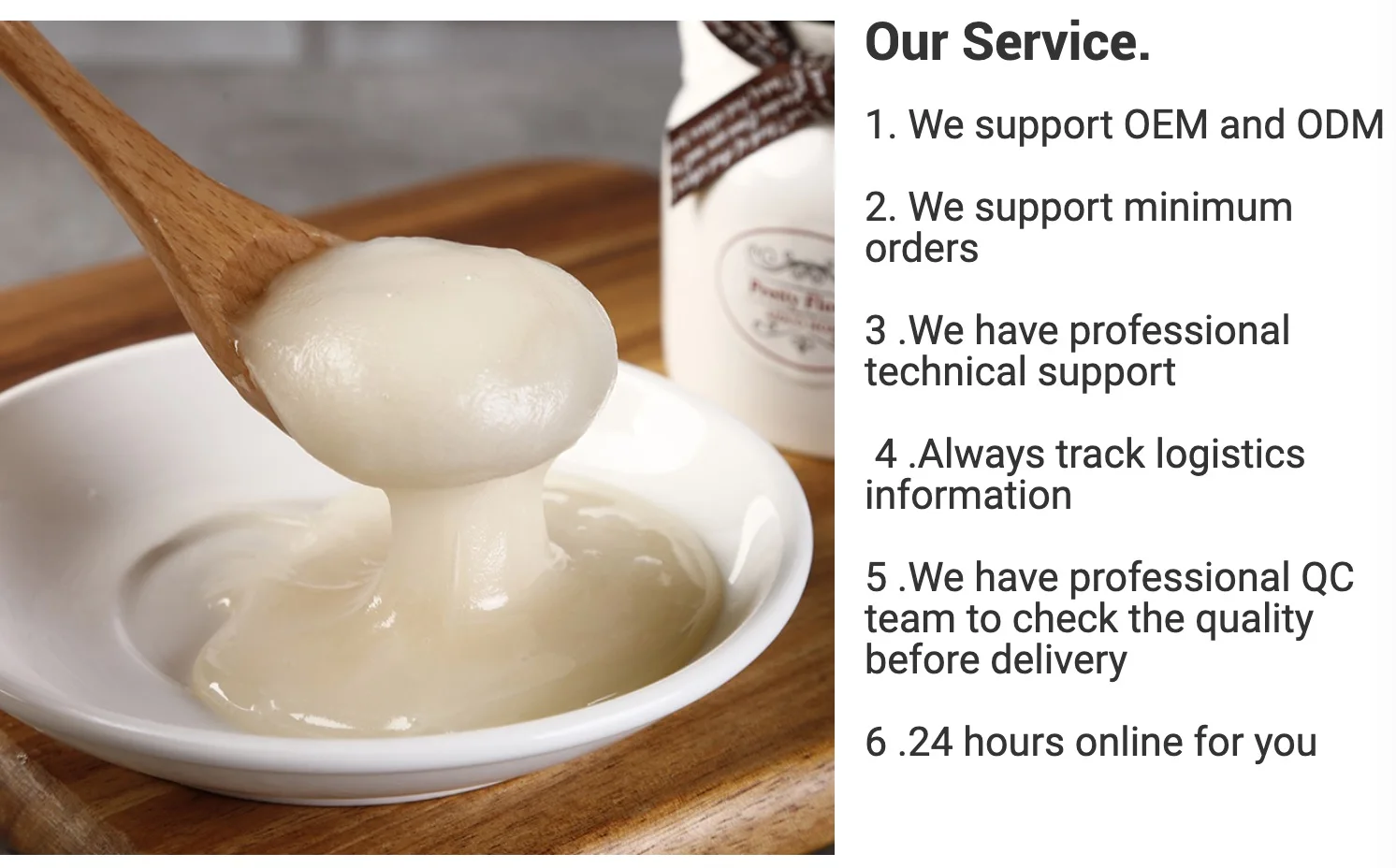 3Q: How many kinds of honey do you have? A: DELI honey has Acacia Honey, Buckwheat Honey, Jujube Honey, Linden Honey, Longan Honey, Vitex honey, Rape Honey, Eucalyptus Honey, Royal Jelly, Polyflower Honey, Honey Powder and many more.