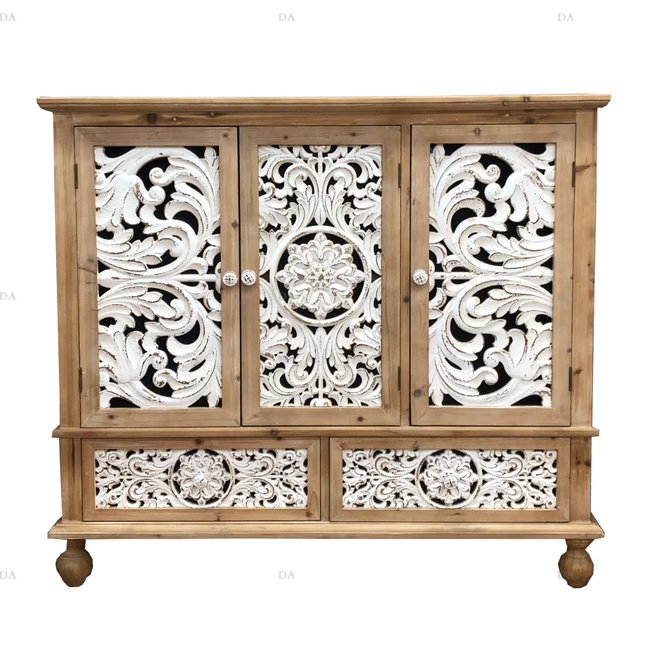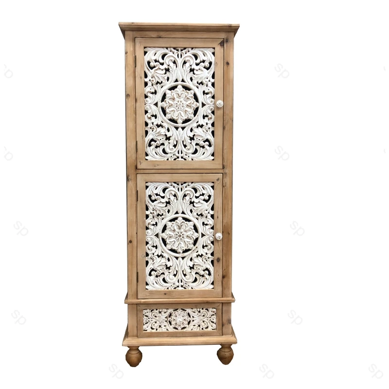 Home Decoration MDF High Cabinet Furniture Elegant Antique White Wooden Carving High Storage Cabinet