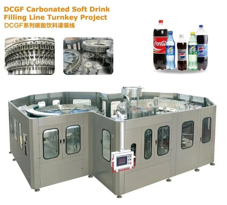 This series of Automatic Carbonated Beverage Filling Machine are applied to used in production of PET bottle-packing carbonated beverage such as aerated water, sprite, coca-cola, gas containing juice , it integrates bottle washing, filling and capping into one body of this machine. It is very convenient to change bottle size by means of advanced bottle conveying technology--bottleneck clamping & bottle suspending technology.
