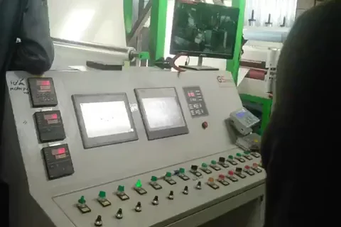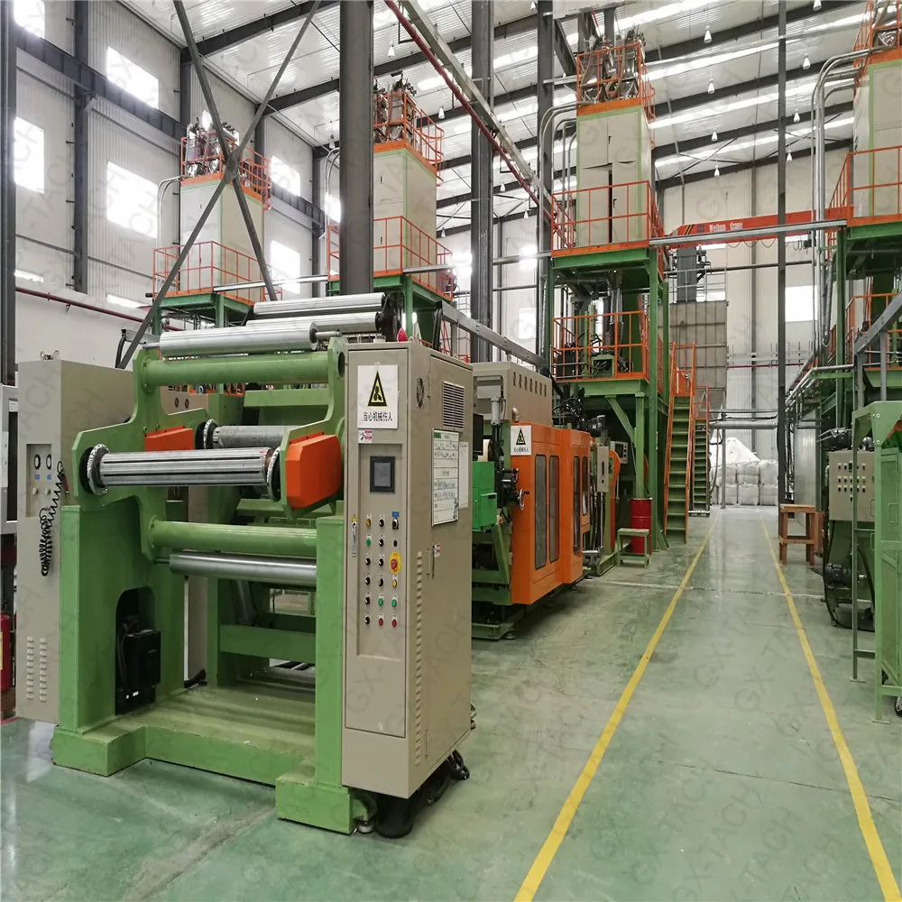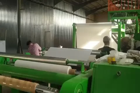 The granules manufactured by the granulating machine are transported to the machine. After heating and strong pushing of the screw, the temperature of the raw material is raised and together with the molten PE material to be extruded into a "T" type die to form a three-layer composite sheet material, stretched by a casting roller and adjust the thickness of the product by controlling the speed, and then cooled and shaped by the cooling wheel set, and then flatten, visually inspect, thickness test,and static elimination, then cut off the ear materials and wind up the finished paper.