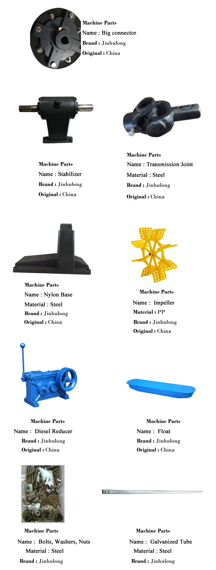 Jinhulong paddle wheel aerator tested by the China National Fisheries Machinery and Instrument Quality Supervision and Inspection Centr in July 2009,all nine parameters show that Jinhulong paddle wheel aerators have proved to meet the requirement of industrial standard SC/T6017-1999,including oxygen transfer rate at 2.59kg/h,surpassing the standard 36.3%power efficiency at 1.71kg/k.W.h,surpassing the standard 36.8%.All test results show our paddle wheel aerator will make significant effect on sewage discharging at the bottom of the semi-intensive and intensive ponds . The waterwheel aerator is mainly composed of five parts: motor, primary transmission big gear or reducer, frame, floating ship and impeller. During