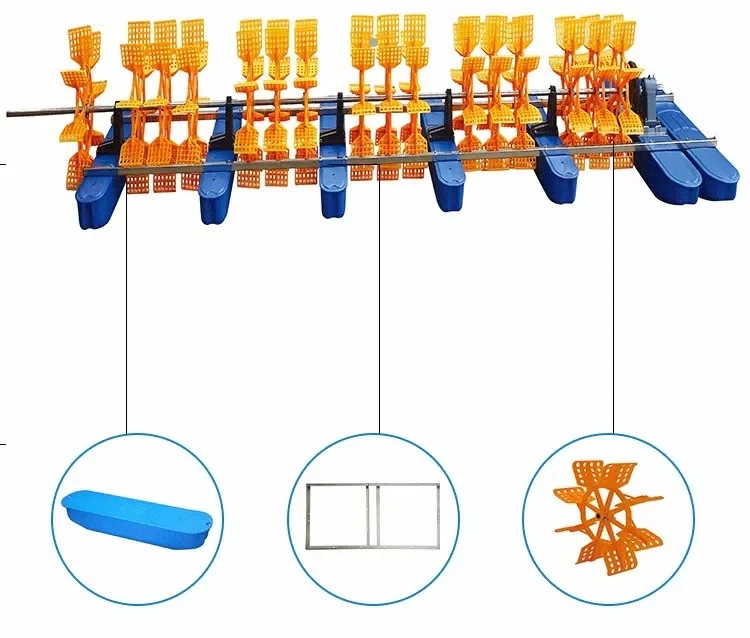 operation, the impeller is driven to rotate by the motor through the primary transmission gear. Part of the impeller blade is submerged in the water. During the rotation, the blade hits the water surface at high speed, arouses water spray, and further dissolves a large amount of air to form dissolved oxygen. The oxygen is brought into the water and generates strong force. On the one hand, the surface water pressure is put into the bottom of the pool, On the other hand, push the water to make the water flow move and rapidly diffuse the dissolved oxygen.