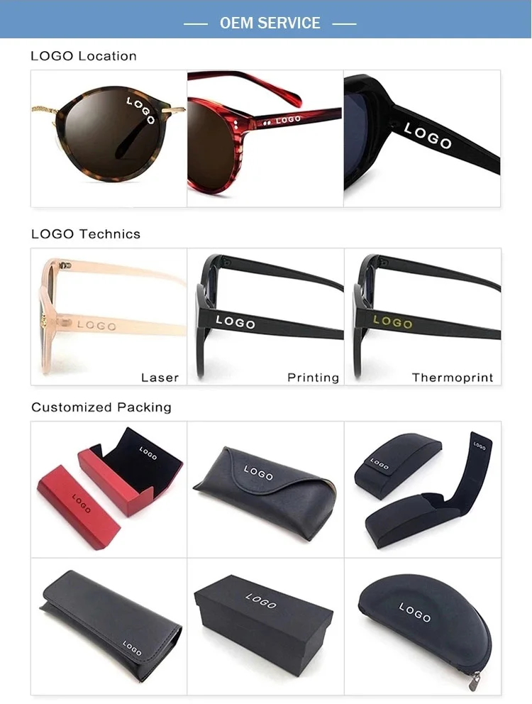 A.We have rich experience in customization. Print or laser logo on temples and lenses.Have many logo method and real sample to show the logo effect.