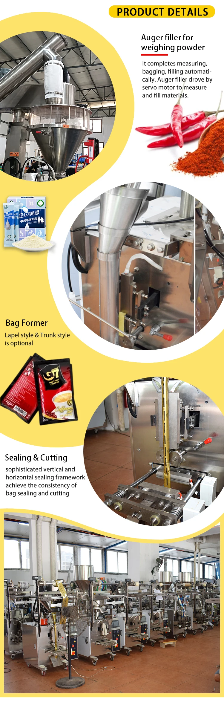 5.Finish all processes automatically in one machine, from measuring, filling, bag making, bag length chasing cutting, date-printing to finished productions conveyance by equipped with measuring device, date printer, photocell, ect.