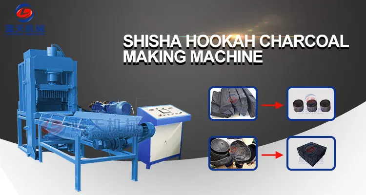 It is a machine can press charcoal powder into small tablets, round shape, cubic shape, strip shape, ringlike shape, etc, also it can press with special words, company name, brand name, telephone number, etc. Good charcoal powder from coconut shell, bamboo, hard wood can press into high quality shisha charcoal, no harm to health.