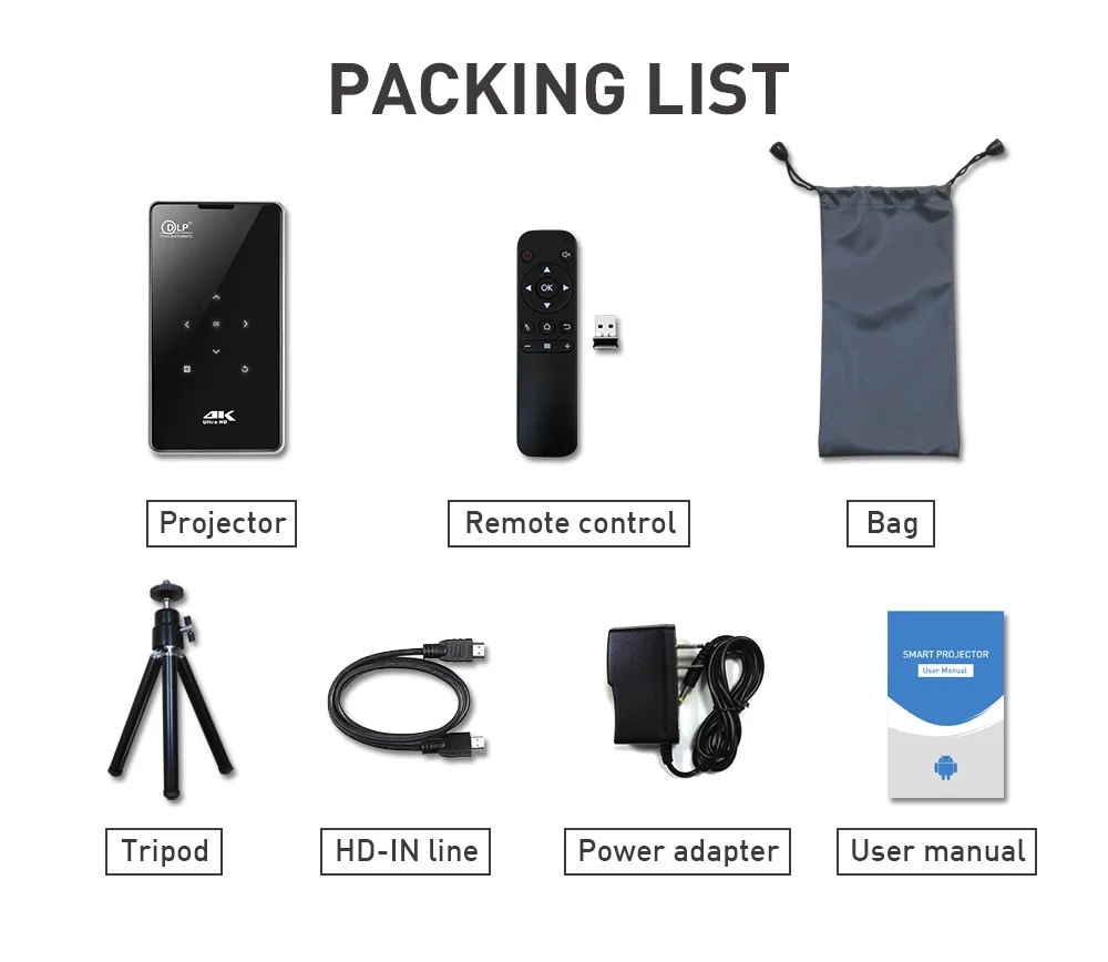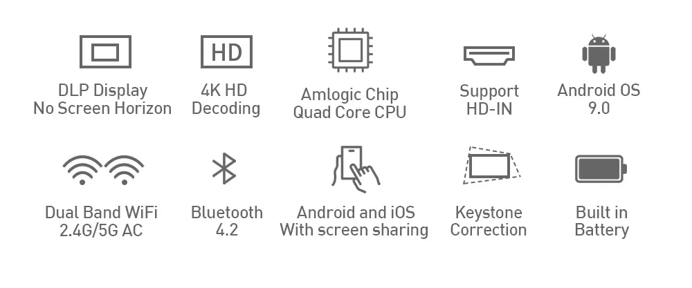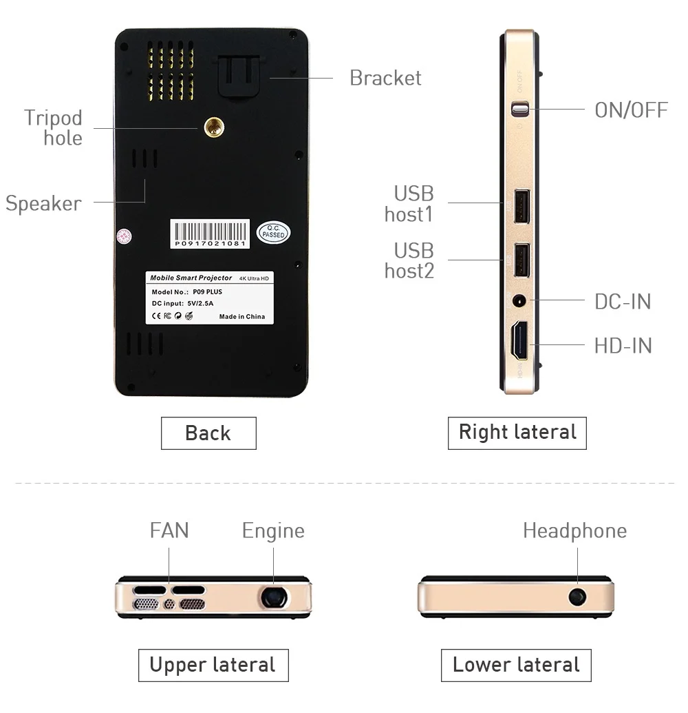 I/O Ports | 1*DC\tAC:AC100-240V,50/60Hz, DC 5V 3A 1*TF Card\tMax 32G 1*HDMI\tHDMI Input 2*USB\tUSB 2.0 1*Earphone\tAudio output, 3.5mm joint (can connect with earphone or speaker box) | ||||