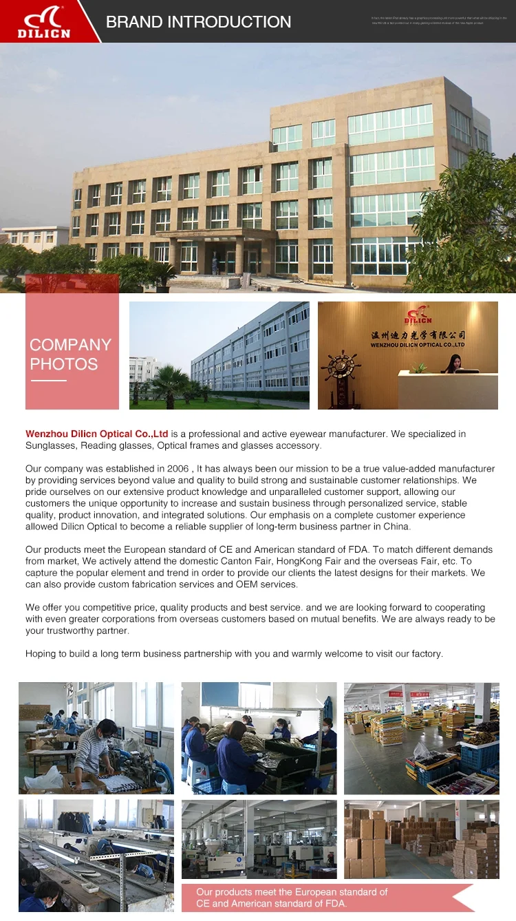 Wenzhou Dilicn Optical Co.,Ltd is a professional eyewear manufacturer. We have more ten years experience for design,manufacturing of Reading Glasses,Clip on sunglass,Optcial Frames,Floating sunglasses! "Know your needs better" is our highest service goal!