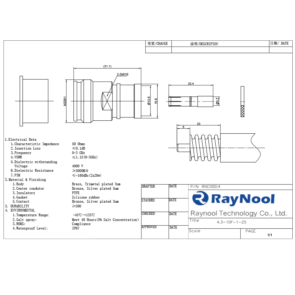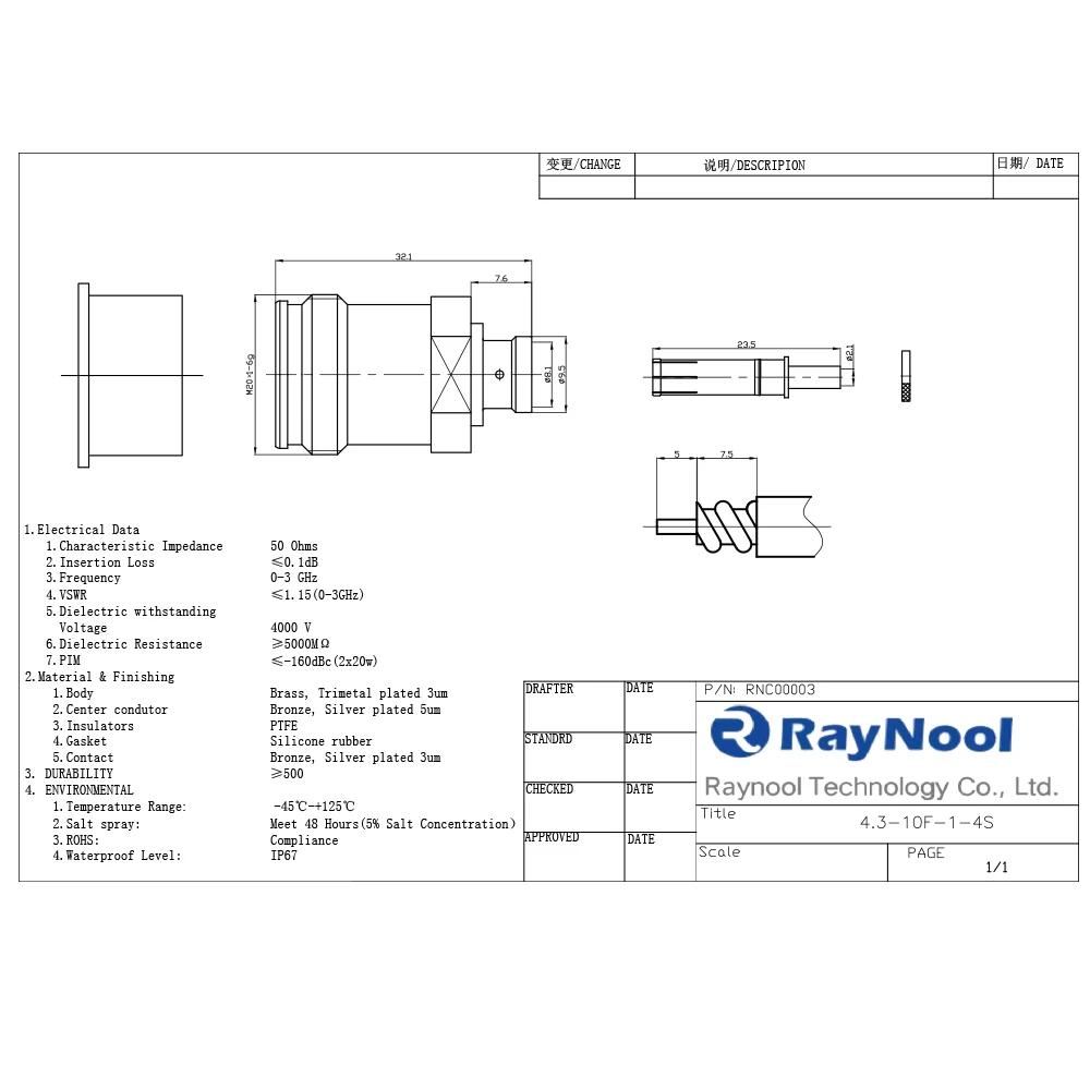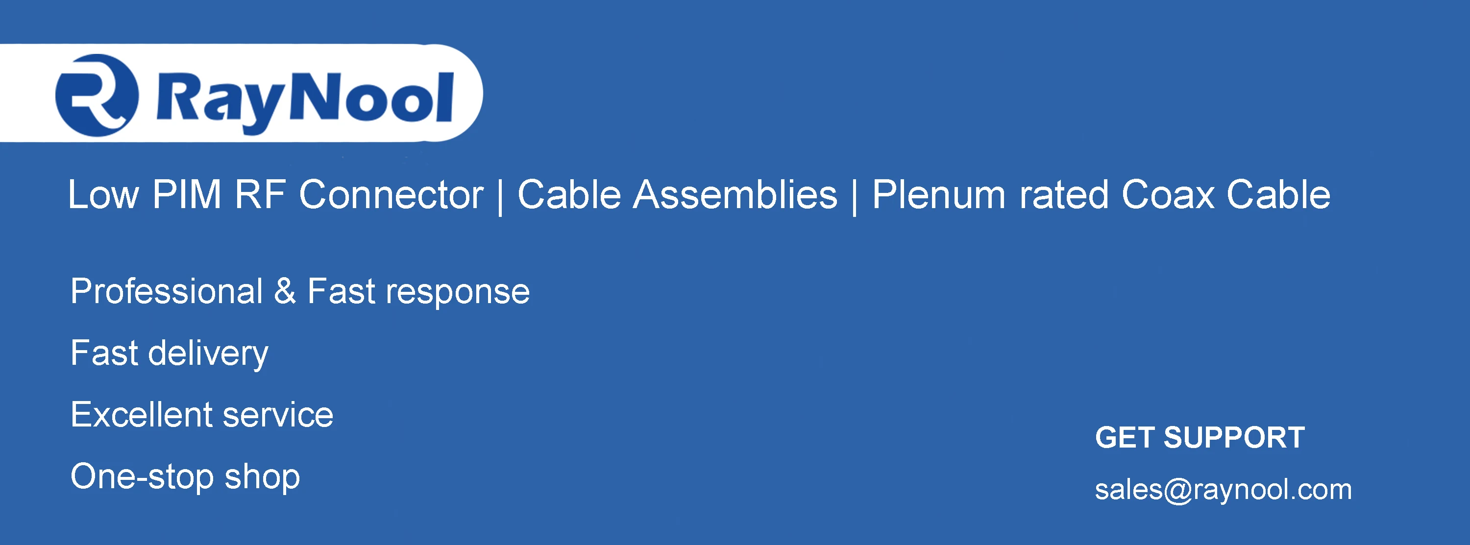 Raynool technology Co.,ltd has Its own R&D team ,and focuses on manufacturing RF connector, Cable assemblies, high speed cable assembly, and accessories for Wireless Infrastructure.