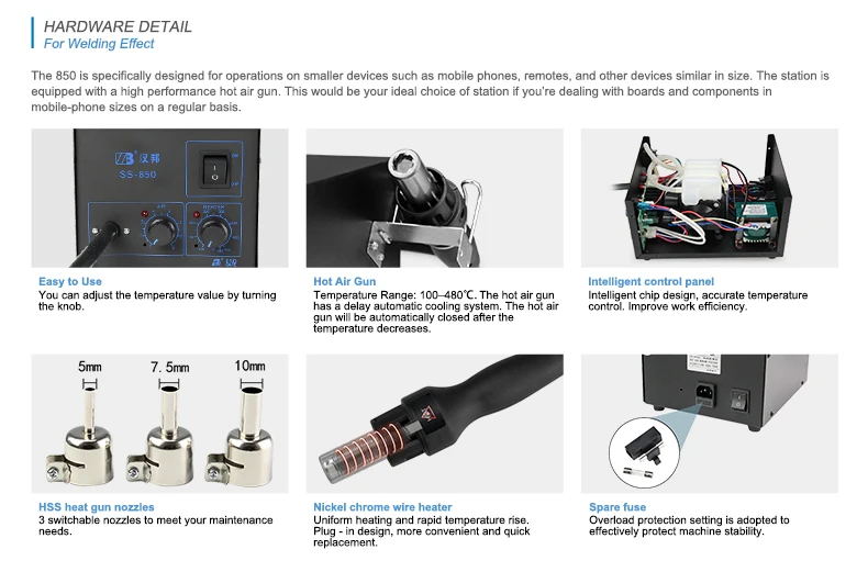 1、 Warm Up Quick: This 850D Desoldering station quickly heats up to the set temperature within 3-5 seconds. The highest temperature is 480 ° C. 2、Digital LED Display: Unique Rework Station With digital LED display, high performance, temperature stabilization and airtightness. Long life and low noise. 3、Automatic Cooling Function: can effectively extend the life of the heater and protect the heat gun. This is safer for the user. It also has a memory temperature function: Turn off the 850D rework station at a certain temperature. If you turn it on, it will quickly heat up temperature. 4、Accurate Temperature Control: Remove BGA IC safely, keep pins intact. Much safer and more reliable. Blowing PCB will not blow it. Much safer and more reliable. Blowing PCB will not blow it off Indispensable product for repairing mobile phones, laptops, PCBs, etc. Suitable for soldering multiple components such as SOIC CHIP QFP PLCC and BGA etc. (especially for flat cables and cable connectors).