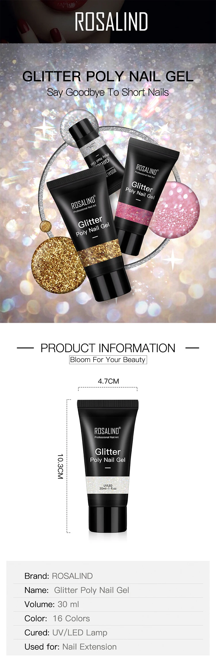 Rosalind oem your logo organic disco party glitter hard nail extensions glue wholesale extend poly nailpolish uv lamp gel polish