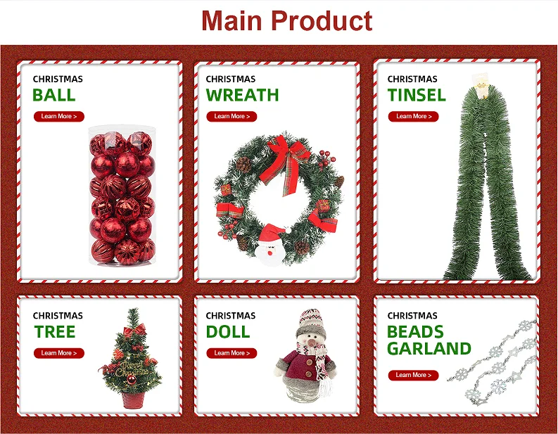 1.More than 30 years experience 2.Factory direct supply: a.factory area:30,000 square meter b.warehouse area:10,000 square meter 3.OEM custom service:size/logo/pattern/package 4.One-stop christmas decoration service:christmas ball/tinsel/wreath/christmas tree/bead garland etc. More cooperation details please contact usonline.