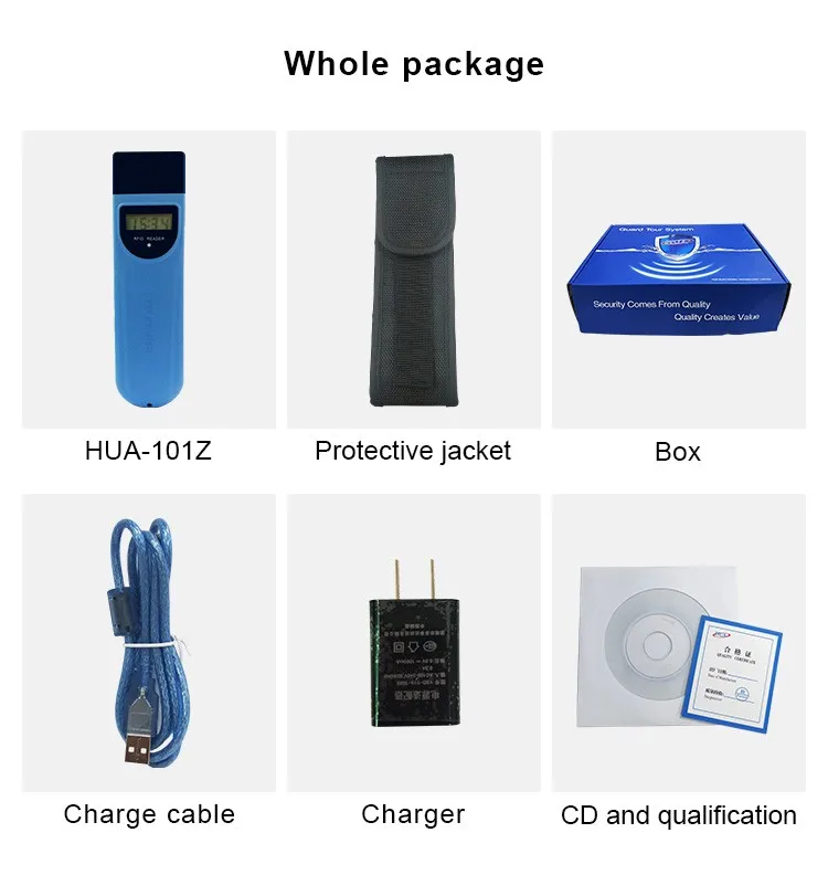 One set includes 1 patrol reader HUA-101F GPS device, 1 charging line and 1 charing plug, 1 cloud management software, 1 certification