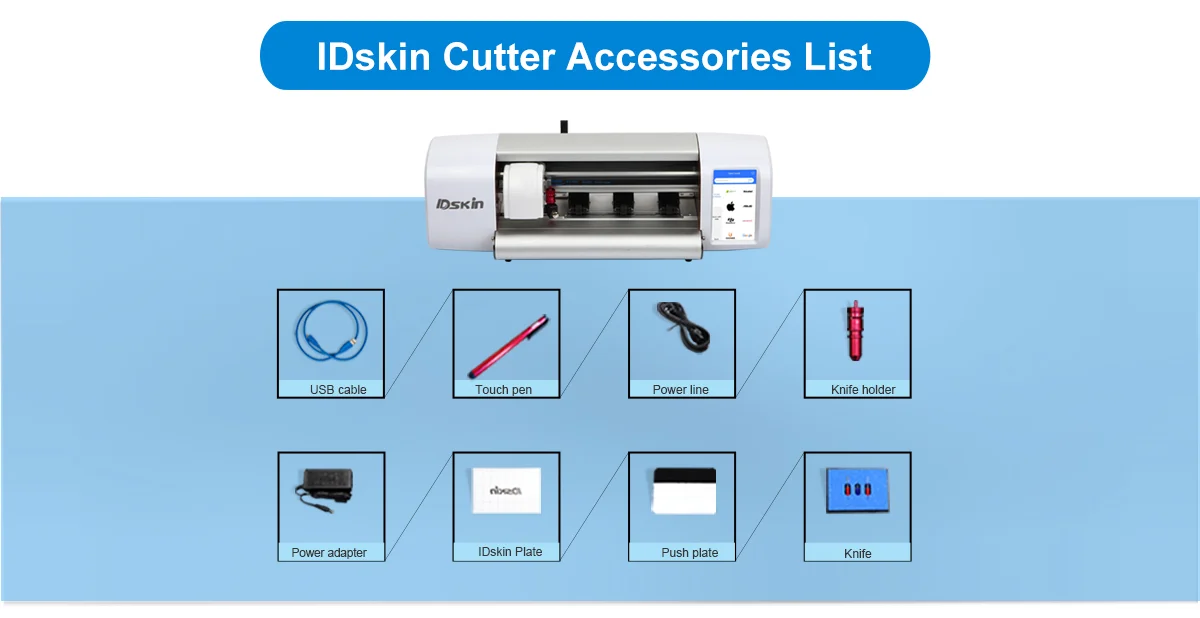 * 1. What's the IDskin cut system include? Daqin provide IDskin cut solution for starting mobile phone protection business. IDskin cut system include: IDskin cut machine, IDskin cut APP (can install on mobile phone / tablet), tool of plate, cloth, various film material (optional) and English training videos.