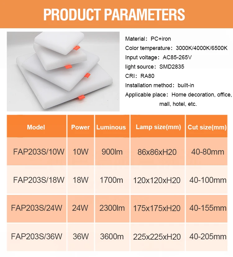 | Lamp Size | 86*86*H20mm | 120*120*H20mm | 175*175*H20mm | 225*225*H20mm |