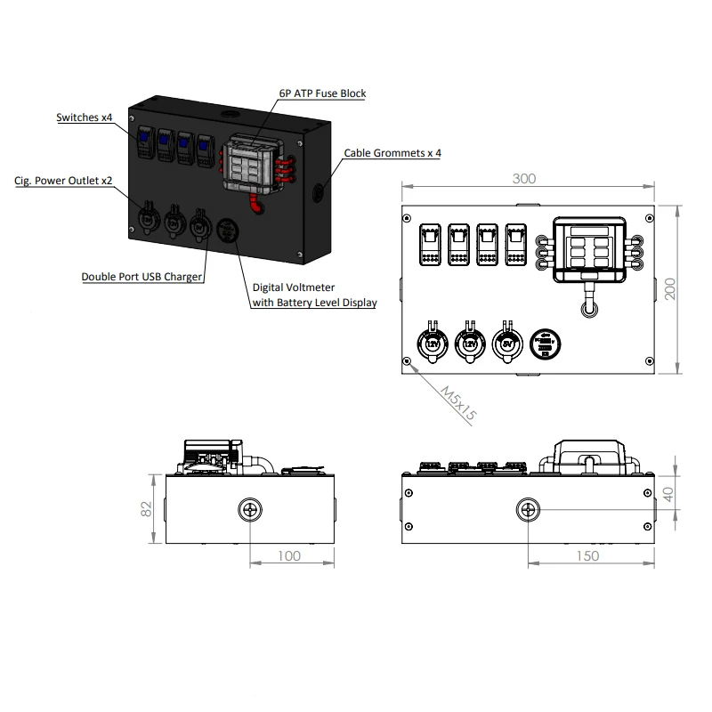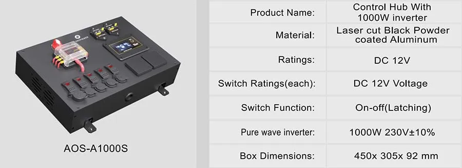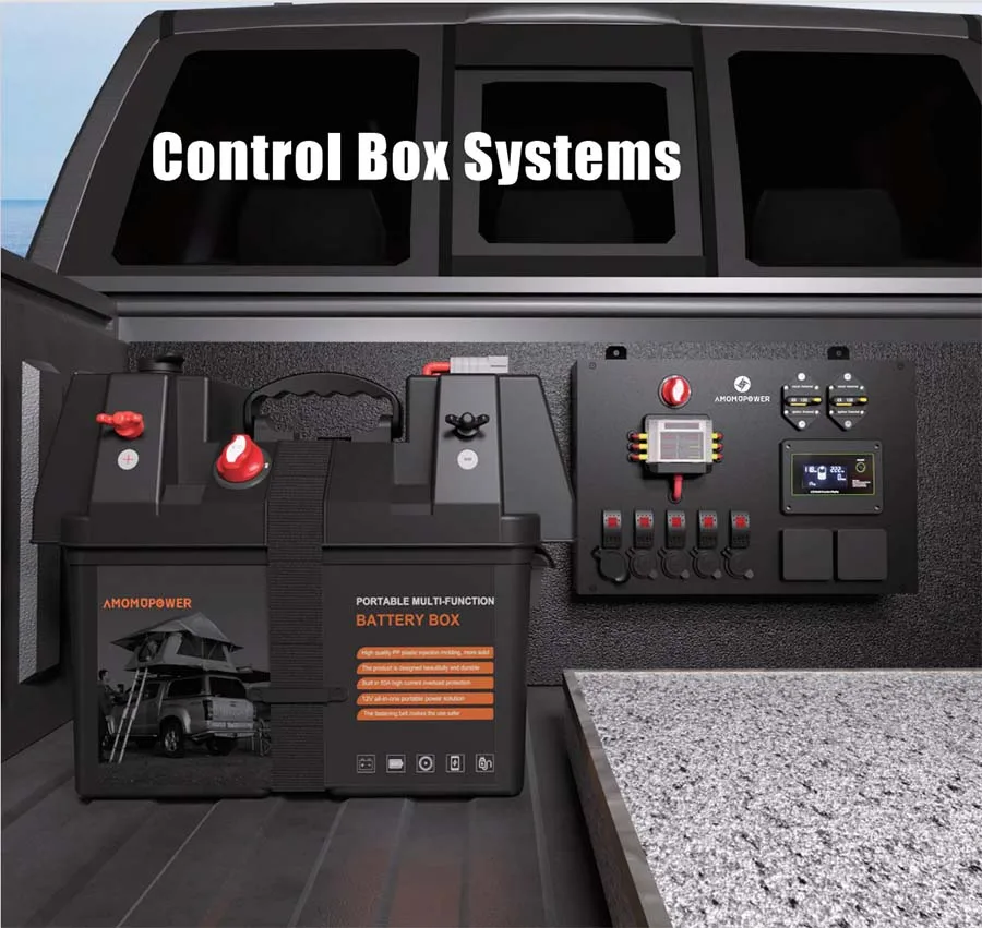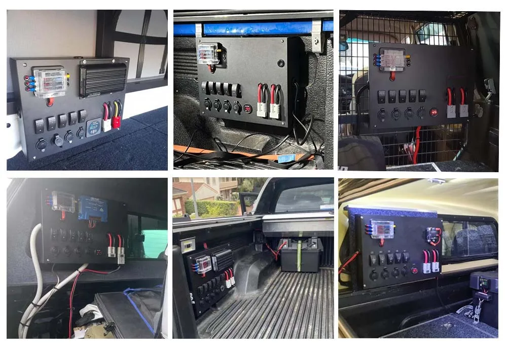 1.Busbar 2.USB charger Socket 3.Rocker Switch 4.Voltage display meter 5.Power Outlet Socket 6.Fuse Block 7.Anderson-Connector 8.Circuit breaker 9.Membrane switch(6 way or 10 way) 10.Battery Switch 11.DC TO DC Charger 12.Solar charger Controller | |