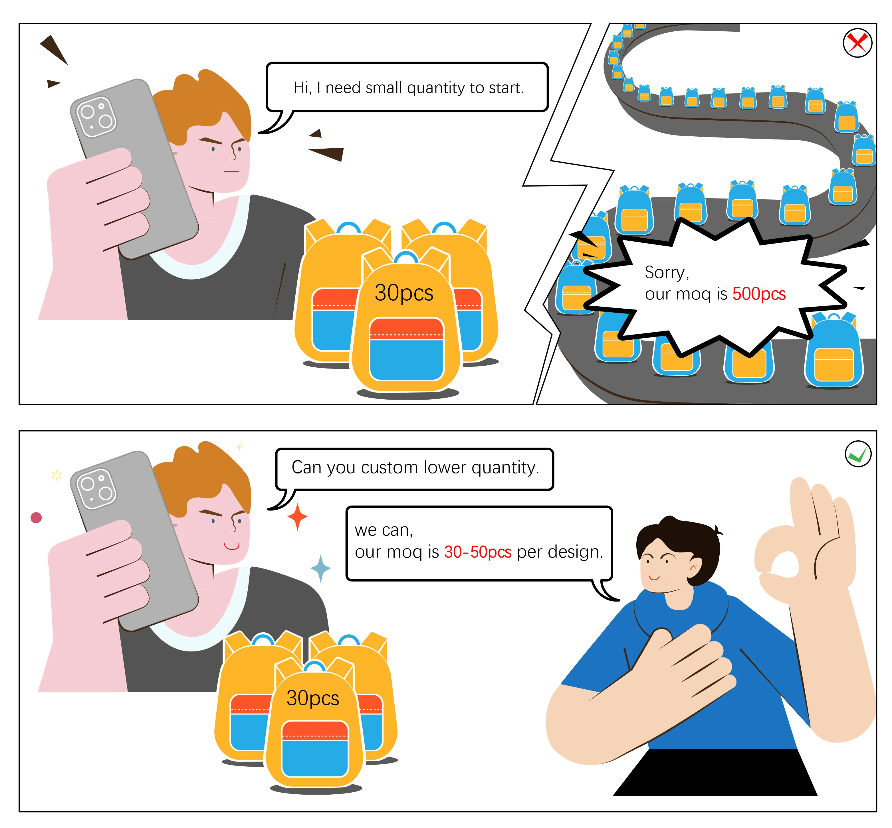 (2)Bulk order: 200 Pcs/Customized design. Because of the different materials and workmanship for different style bags, the MOQ will be changed. Please contact us for details.