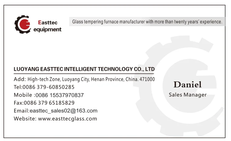 Luoyang Easttec Glass Automation Equipment Co., Ltd., establecida en 2006, es una empresa de alta tecnología especializada en diseño, fabricación y venta de equipos de procesamiento térmico de vidrio. Easttec cuenta con un grupo de técnicos profesionales dedicados al diseño y fabricación de equipos de procesamiento profundo de vidrio durante más de veinte años. Y con una rica experiencia, innovación continua, diseño exquisito y las ventajas obtenidas de las empresas europeas, la empresa fabrica nuevos equipos de procesamiento de vidrio con excelente calidad, rendimiento confiable y precio razonable.