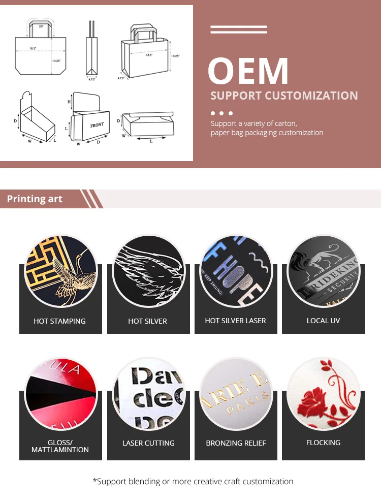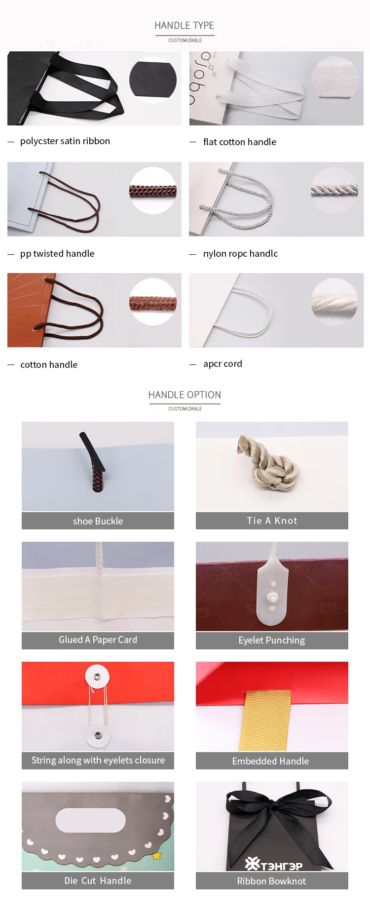 Handle Types | Ribbon Handle, PP Rope Handle, Cotton Handle, Grosgrain Handle, Nylon Handle, Twisted Handle, Flat Paper Handle, Die-cut Handle or Customized Handle |