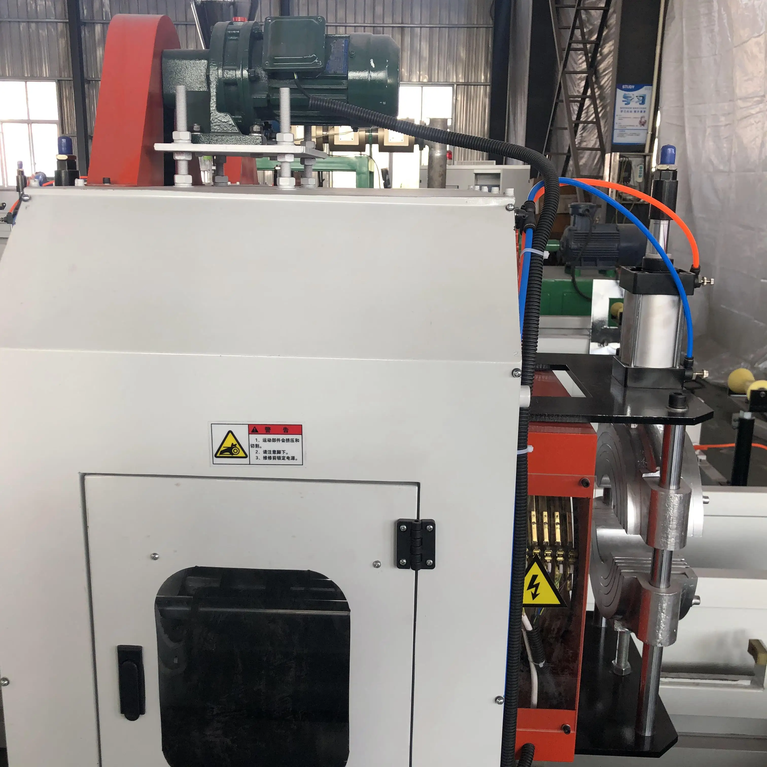 machine is mainly used for cutting and chamfering of PVC pipes, which has the characteristics of fast cutting speed, no burr on the section, smooth chamfering, high cutting accuracy of fixed length and so on. The control device adopts Mitsubishi PLC controller, Tianjin Luosheng text display, Chinese and English menu display manual cutting, automatic cutting free conversion, with emergency reset button, automatic detection of saw blade position. Fuji frequency converter is used to adjust the cutting speed of different caliber pipes. The eccentric wheel is used for feeding, the performance is fixed without clamping, the milling depth is adjustable, the tool holder is equipped with pushing guide device, which can push the cut pipe to the expanding machine station better, and the outside is equipped with pushing guide groove, which can more effectively ensure the online connection with the expanding machine and complete the full-automatic expanding requirements. For pipe cutting with different sizes and diameters, the machine is equipped with feed parameters, and feed push rod is equipped with scale line corresponding to pipe diameter to control the chamfering of pipe cutting with different diameters. The operation is very simple and convenient to ensure humanization and automation of production. 1, Features of planetary cutting machine: 1. Cutting range: pipe diameter 110, 160, 200, 250, 315, 400 and equipped with a complete set of clamps. 2. Cutting speed: each cutting chamfer cycle shall not exceed 8 seconds (according to the cutting pipe length of 6m). 3. Maximum cutting wall thickness: 40mm 4. Longitudinal moving length of cutting platform: 1200mm 5, Cutting length: minimum 600 mm, no maximum cutting limit. 6. One side chamfering of pipe, the chamfering size is adjustable, and the minimum chamfering wall thickness is not less than 1.5mm.