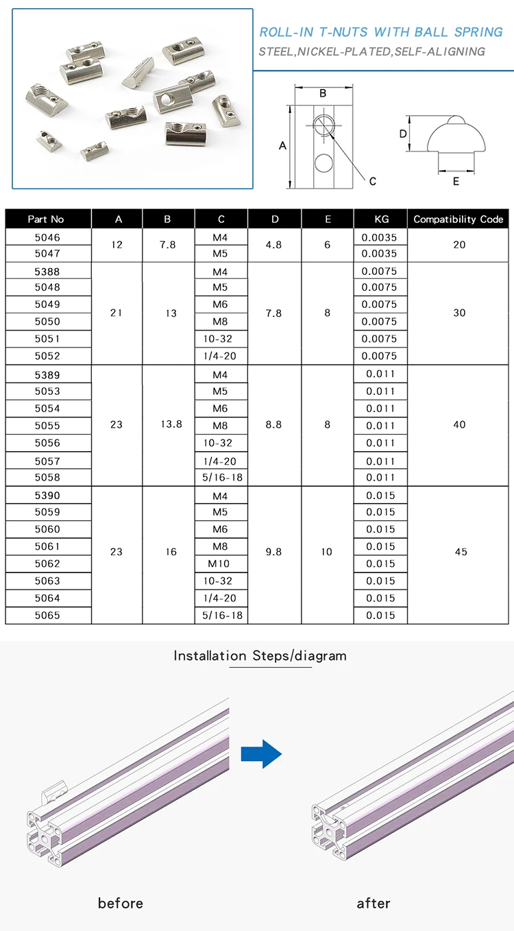 Product Name | Steel OB40 M4 Roll-in T-nuts with ball spring for aluminium profile |