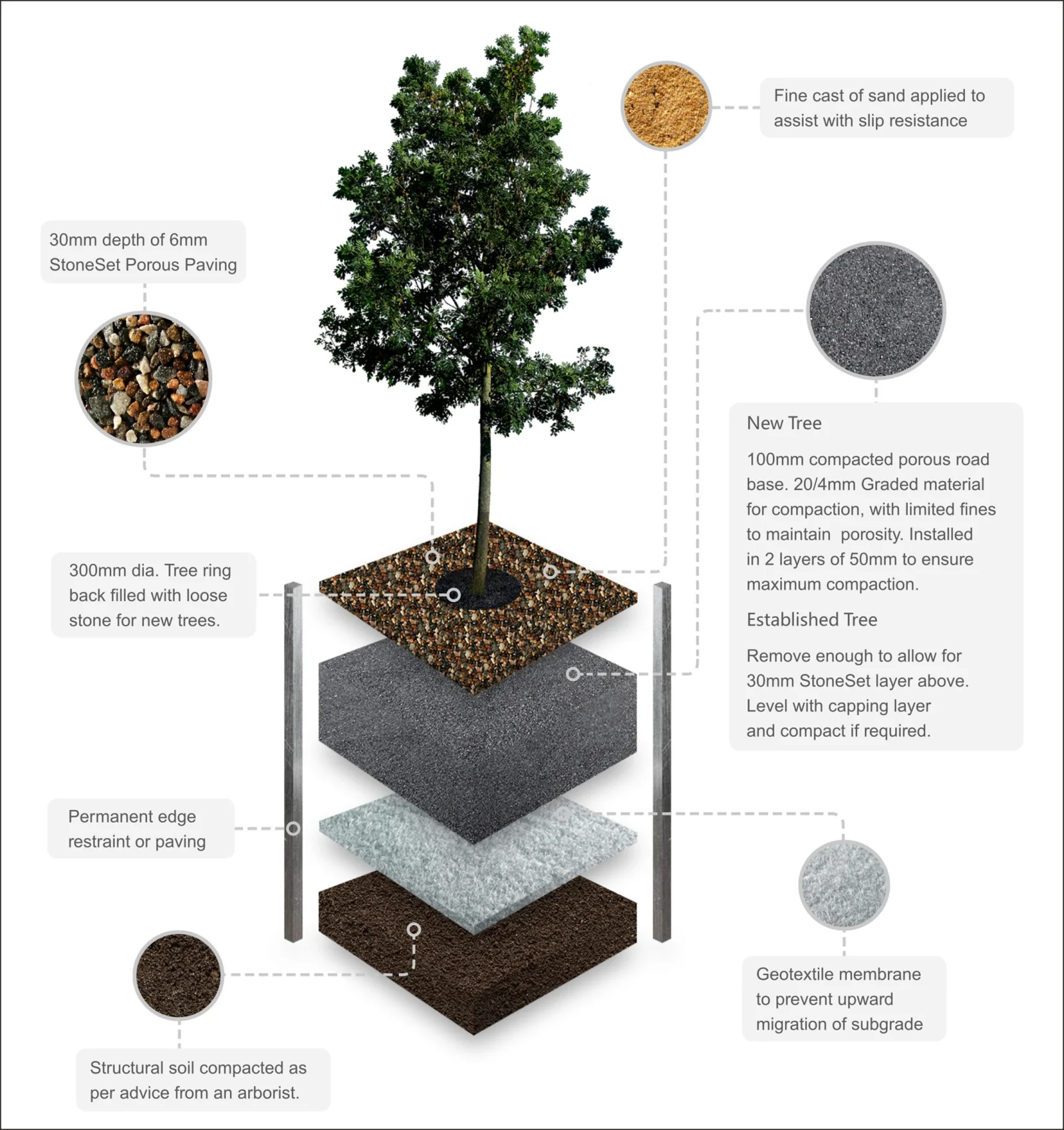 The open matrix allows water to drain through to the base, eliminating water bonding and allowing water to drain to planted areas or land drains.The surfacing may be applied to SuDs compliant bases and sub-bases, reducing the impact of urban development on flood risk and allowing water to flow into water courses. Edgings created from brick, stone, timber or steel should be installed to resin and protect the resin bound surfacing.