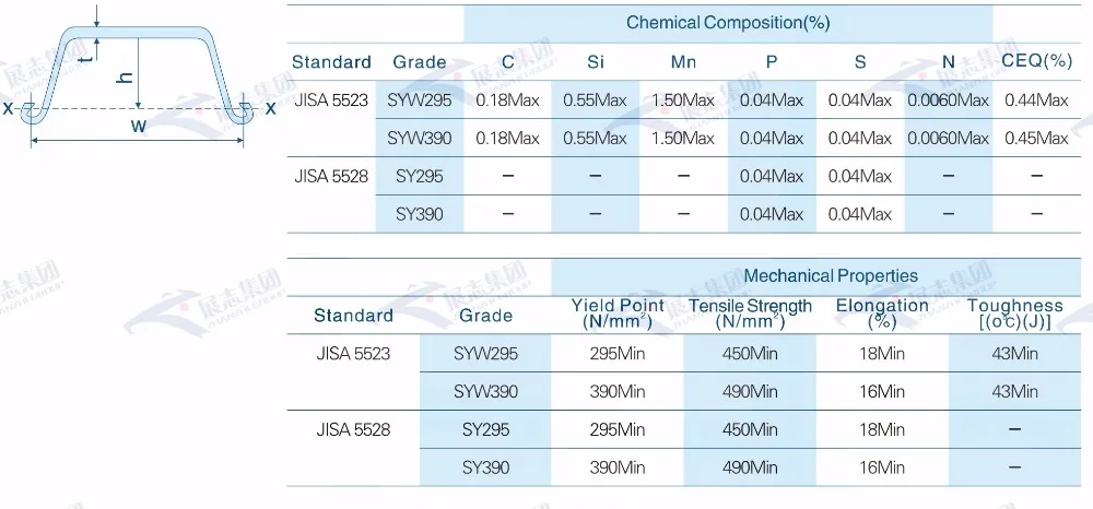 Chemical composition of steel sheet pile / Mechanical properties of steel sheet pile