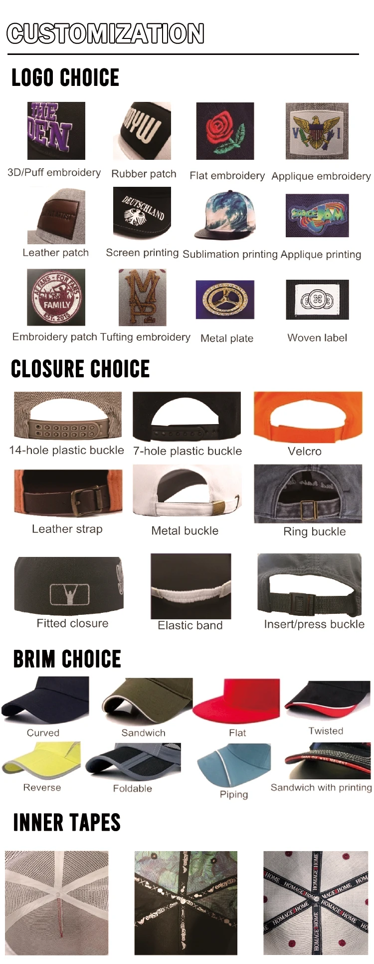 Back Closure | Snapback Closure | 7 Holes Plastic Buckle, 14 Holes Plastic Buckle,Metal Buckle, Press Buckle, Shoes Buckle, Zipper Buckle, etc. | |