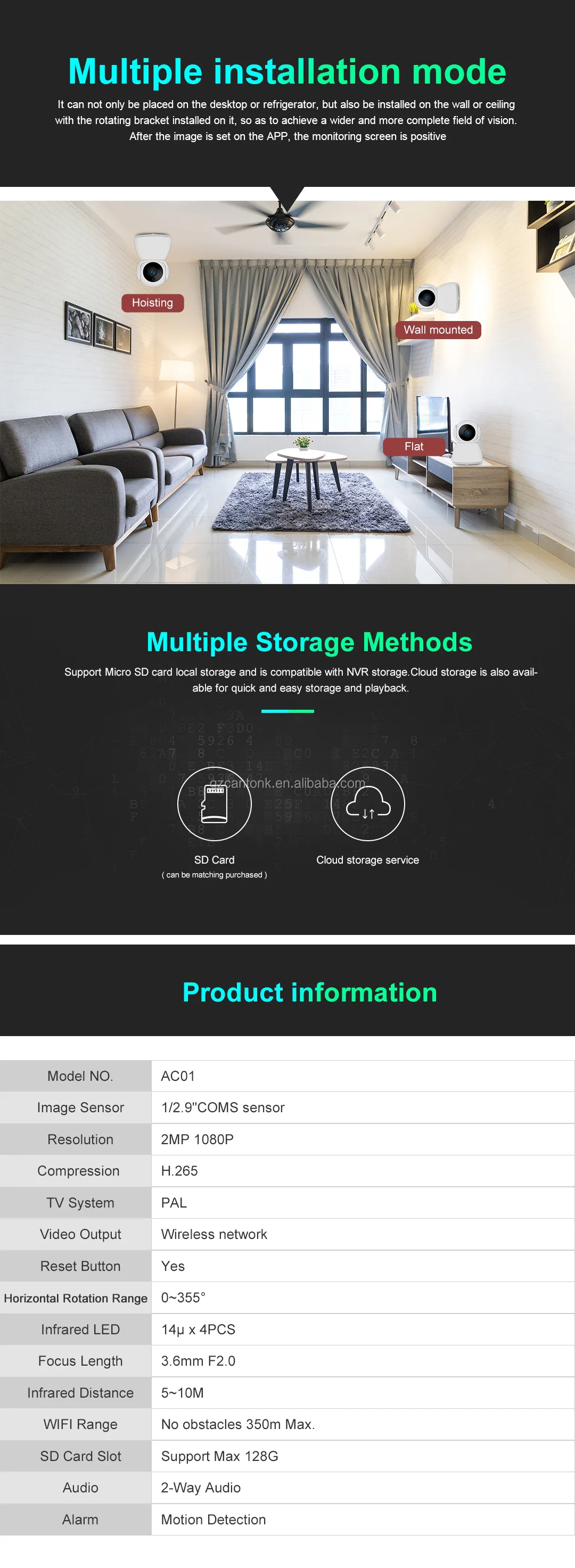 Support Cloud storage, Micro SD card (up to 128GB), Two-way Audio, Motion Detection, Push video to Smart Phone, Full Color Night Vistion
