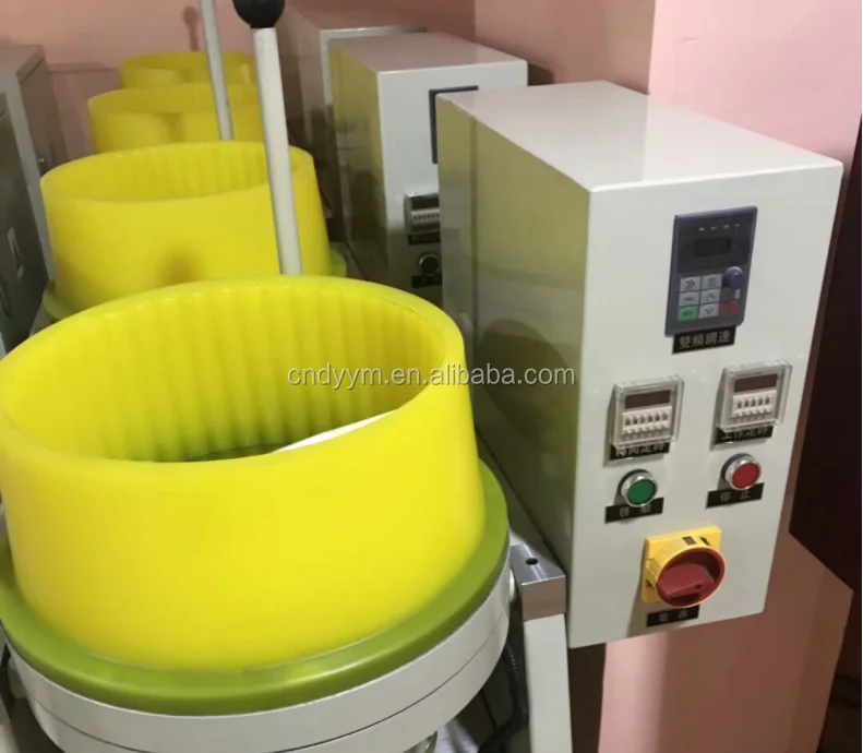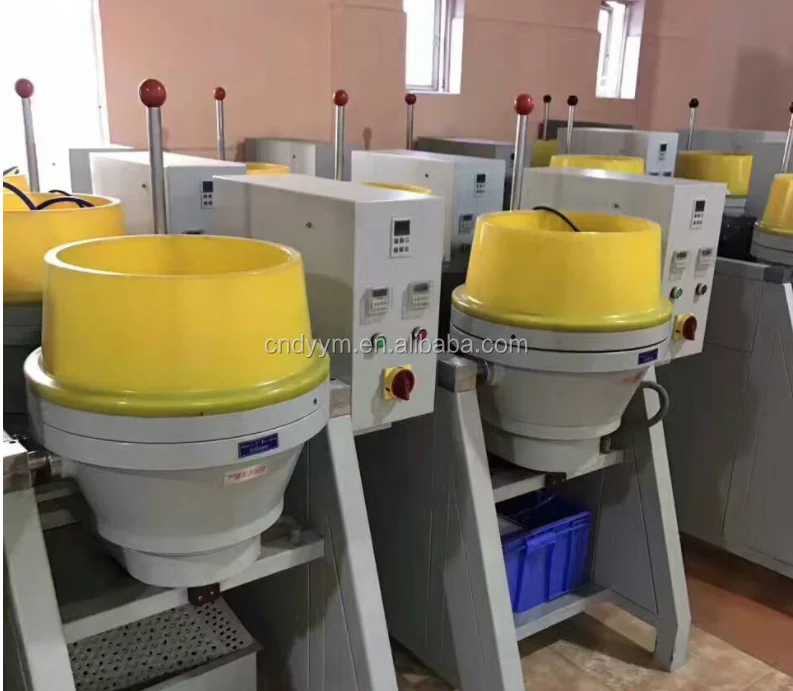 The equipment is used for wet-polishing and dry- polishing, it includes grinding disc, rotating disc,abrasive-resistance ring, driving system and electric- control system. When the rotating disc rotates,the abrasive material and workpieces in the grinding disc will move upward along the barrel shell for the reason of centrifugal force action. Then fall back the center of the rotating disc from the high position by their weight of workpieces and abrasive material. Repeat the above movement to make the grinding media spiraling movement, and realize high efficiency grinding effect. It is suitable for workpiece surface processing of various gold and silver jewelry, electronic parts, clocks and watches,glasses parts etc.on deburring, chamfering, mirror -finish polishing, high gloss precious polishing.