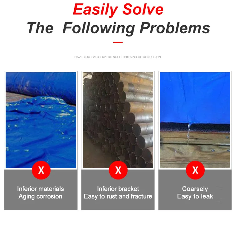 Features | 1. Strong waterproof, Sunproof, Cold crack resistance, Anti-mildew and Anti-static treatment. 2. Great strength, good flexibility and adhesion strength. 3. High tenacity polyester yarns with laminated technology and hot-melt PVC coating strength with stable color fastness. 4. Best before-after sale services. | ||||||