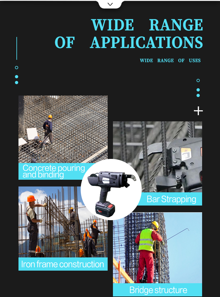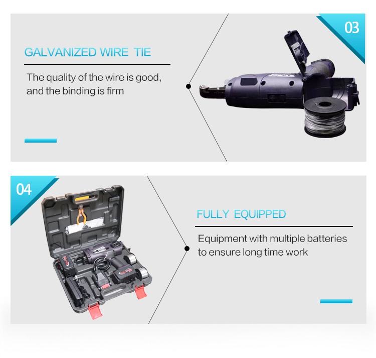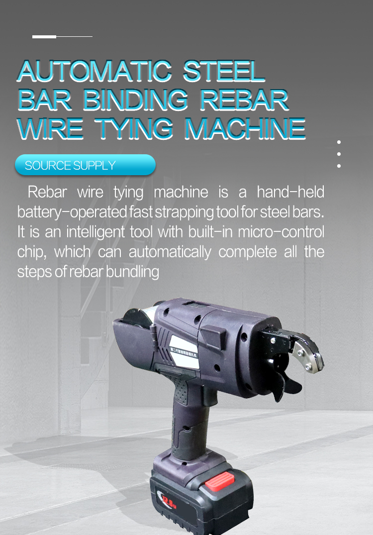 The steel bar bundling machine is a smart tool with built-in single-chip microcomputer, which can automatically complete all the steps of steel bar bundling. It can be widely used in the field of construction engineering, instead of manually bundling steel bars. The steel bar binding machine is mainly composed of four parts: the body, the special wire reel, the battery box and the charger.Steel Bar Wire Binding Machine