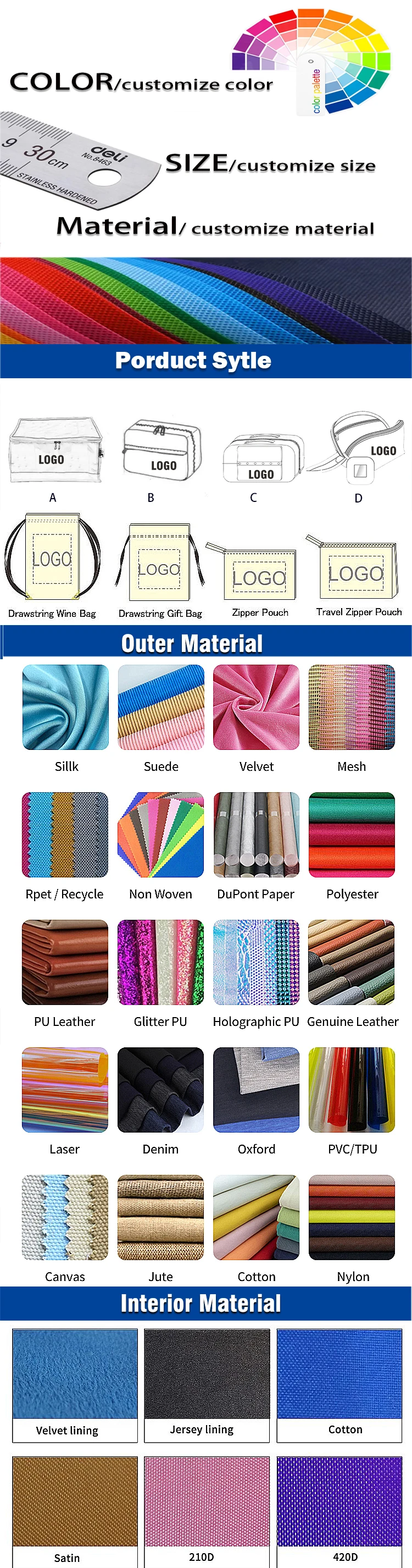 A:We specialize in polyester,non-woven, nylon, RPET, cotton, canvas, jute, felt,velvet,bamboo,and other environmentally friendly materials bags, including a variety of styles, shopping bags,gift bags, promotion bags,tote bags,drawstring bags,dust bags,foldable bags, cosmetic bags, storage bags, cooler bags,garment bags,aprons and ultrasonic bags.