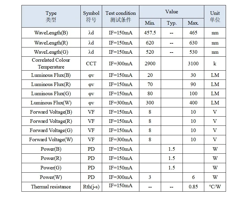 1310 RGB+W COB LED | 8W | Red | 8-10V | 150mA | 620-625nm | 4S1P | 70-90LM | / | ||||||||