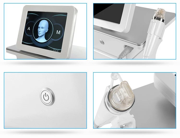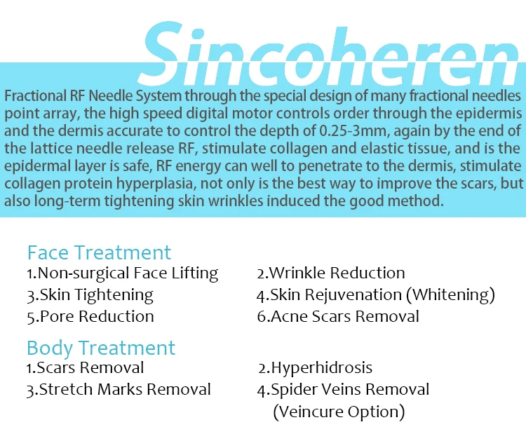 Fractional Micro Needle RF System through the special design of many fractional needles point array, the high speed digital motor controls order through the epidermis and the dermis accurate to control the depth of 0.25-3mm, again by the end of the lattice needle release RF, stimulate collagen and elastic tissue, and is the epidermal layer is safe, RF energy can well to penetrate to the dermis, stimulate collagen protein hyperplasia, not only is the best way to improve the scars, but also long-term tightening skin wrinkles induced the good method.