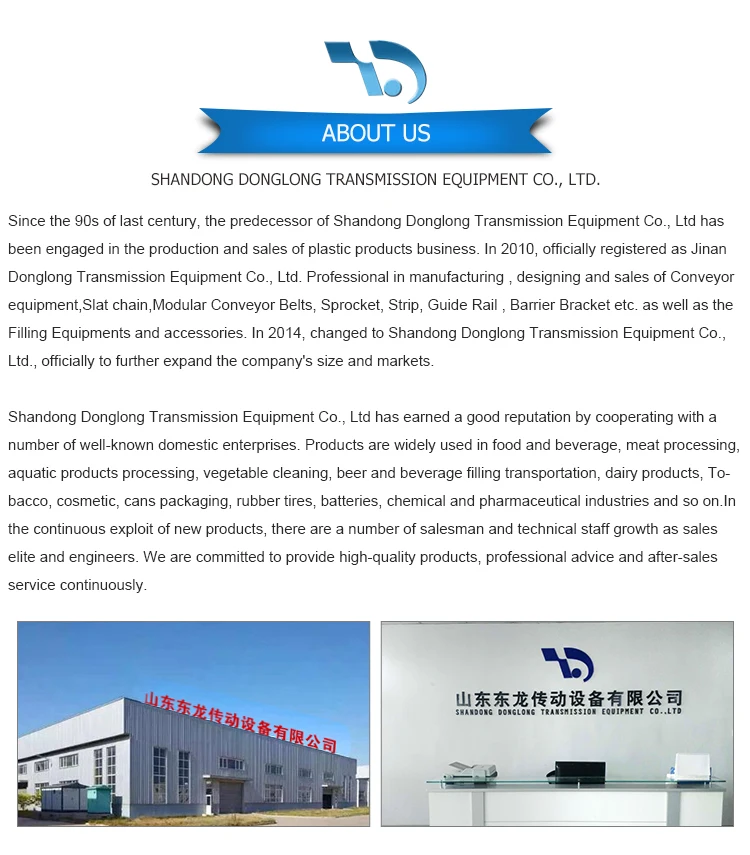 Shandong Donglong Transmission Equipment is mainly engaged in the production and sales of engineering plastic chain plates, modular mesh belts, sprockets, chains, guide rails, guardrail brackets and other related accessories, as well as the production conveyor lines and filling systems. Used in food and beverage, meat processing, vegetable cleaning, beer and beverage industries, all Donglong staff cordially welcome home and foreign clients coming and cooperating with us.