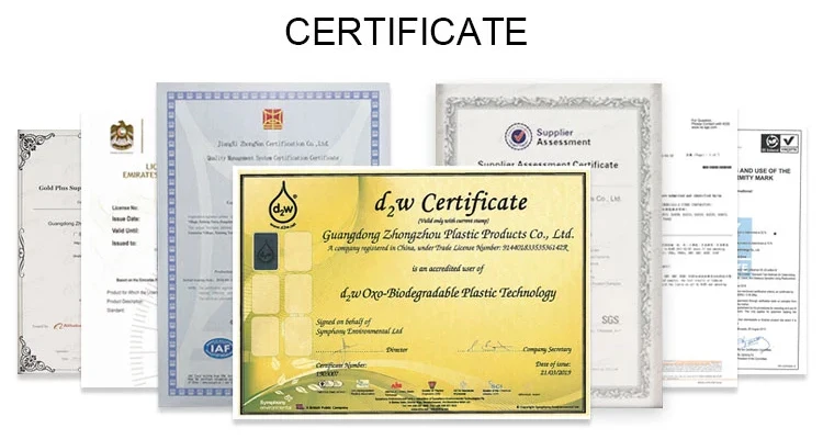 Certificates | ISO9001: 2015, IAF, GRS, ASTM Seedling, D2W, US California Proposition 65, SGS, FSC, etc |