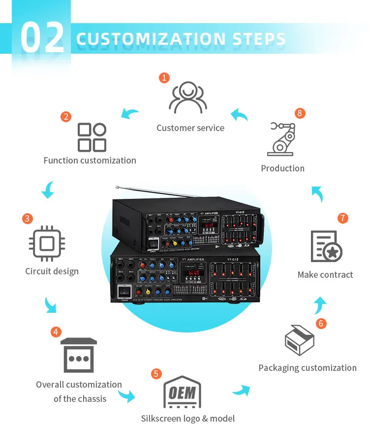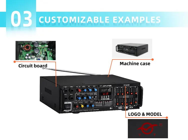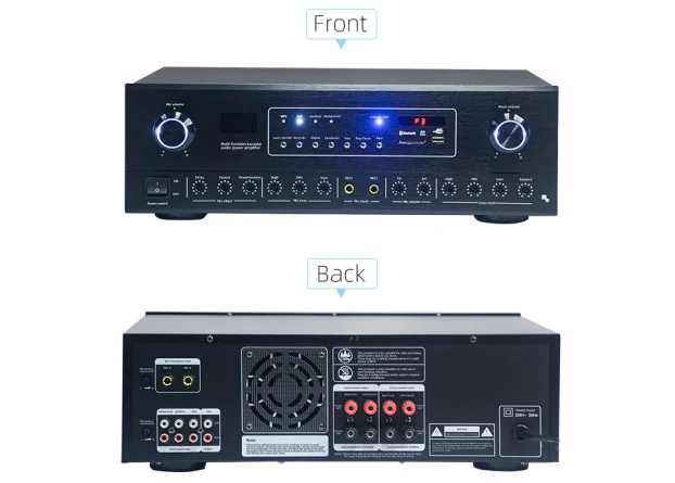 Built-in MP3 player, Bleutooth, optical fiber, coaxial, remote control function, digital display screen; Independent adjustment of microphone and music, 2 wired and 2 U section wireless microphone input, 3 audio signal input, 1 audio signal output, 2 groups of terminal output, music and microphone with total volume limiter, voice control fan cooling.