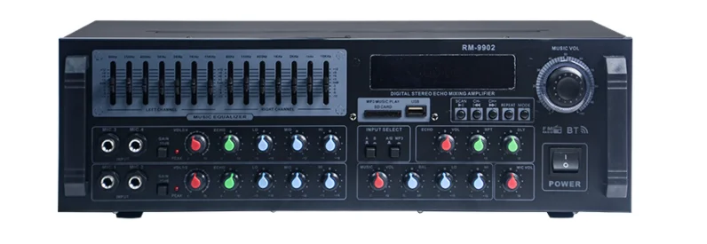 Output power 2*200WVoltage AC220/110V 50/60Hz Side 430*280*130(MM) Function Introduction Built-in MP3 player, bleutooth, FM radio, color displays, 4-way microphone input, AB stereo signal input, microphone high school bass, echo, repeat, time delay adjustment, high and low sounds music, balance adjustment, 7 section of equalizer, lines and recording signal output, microphone direct sound output, high and low level 2 groups speaker terminals output.
