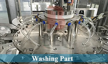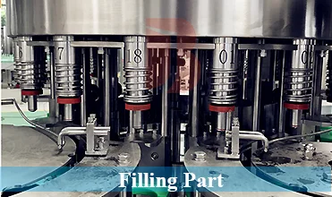 After washing, bottles are moving into filling system by star wheel; at the same time, filling valves start working, until to the setting filling level; bottles are moving to next section;
