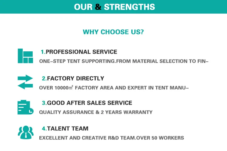 Our tent product has passed the engineering tests and have SGS certificates, Including low temperature bending resistance certification, Scarlett 650g anti-UV4-5 certified, UV-resistant and certified mold proofing antibacterial, flame retardant certification 650gsm-B1, 850gsm-M2 flame retardant certification.