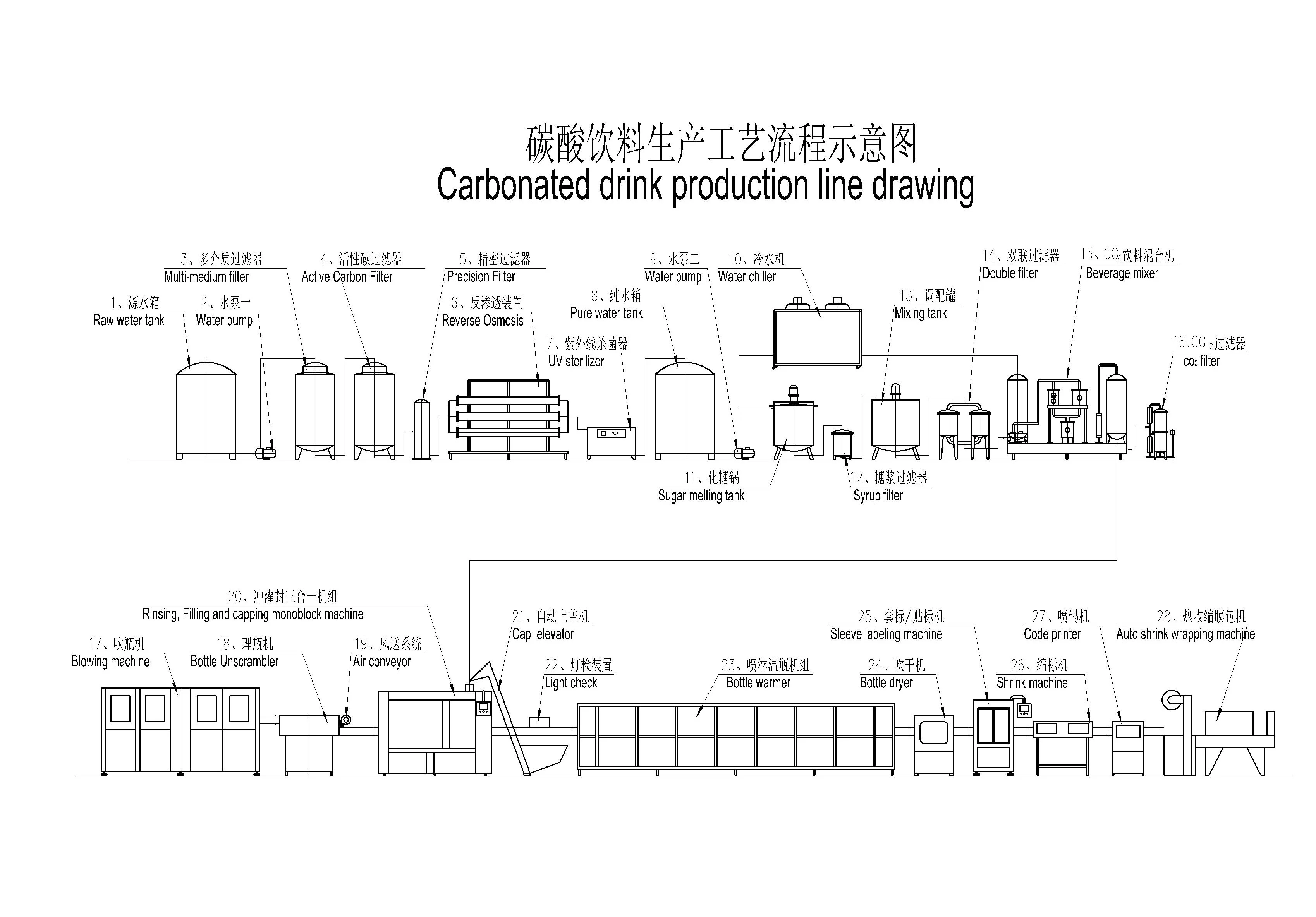 The series equipment is used in production of PET bottle-packing carbonated beverage such as Coca-Cola, containing gas mineral water, sprite, containing gas juice etc. The machine combines washing/filling/capping with complete automation, and the filling process adopted the micro-pressure technology, which makes filling process faster and more stable.
