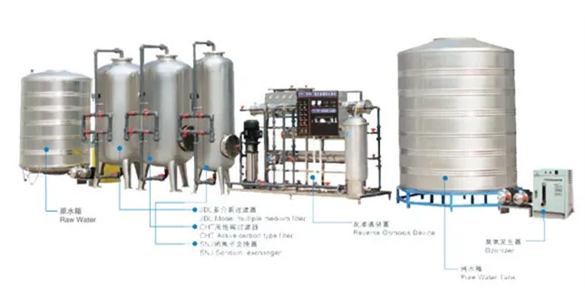 The water treatment system is pre-treating amd desalting the tap water in the raw water tank in the RO system to get pure water.The pre-treatment device consists of quartz sand filter, active carbon filter, natrium ion exchanger and precision filter onizer and so on. we adopt imported RO membrane of Hydranautics from U.S.A for RO system. The structure of whole line is simple, the operation is convenient, the technical level is high. This system is the most ideal drinkable water production line.